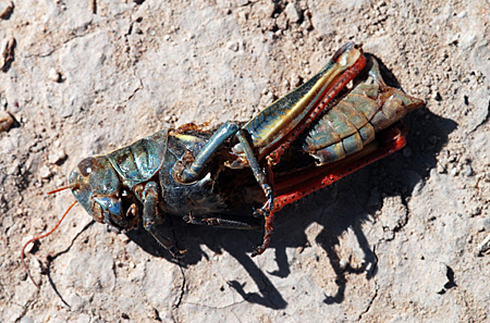 By late October, grasshoppers that have succumbed to disease, parasites, or simply old age become a common sight. Melanoplus thomasi, San Pedro House east of Sierra Vista, AZ (27 October 2008)