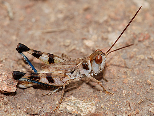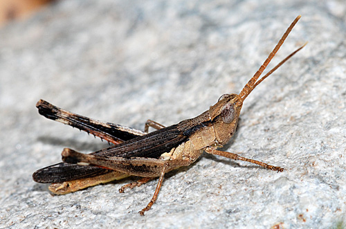 The White-whiskered Grasshopper (Ageneotettix deorum) ranges from mesquite grassland up to mixed conifer forest. The white "whiskers" are the antennae (25 August 2008)