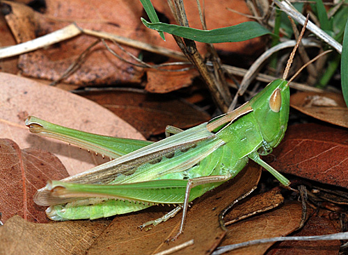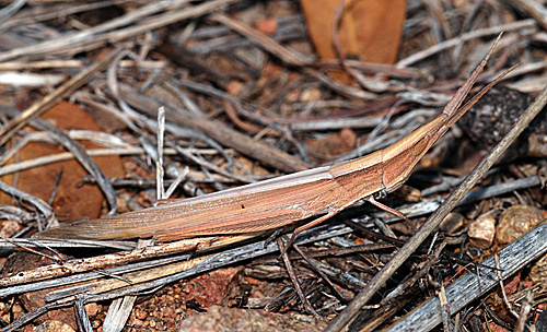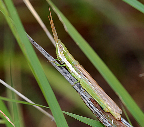 Mantled Toothpick Grasshoppers (Paropomala pallida) occur in both brown and green forms making them difficult to spot in the grasses they inhabit (25 August 2008)