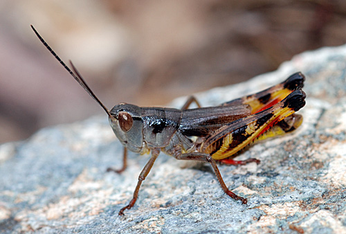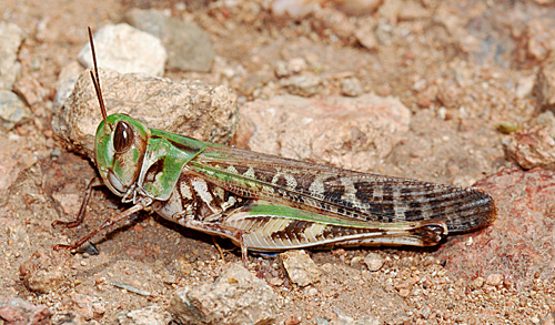 Montezuma’s Grasshopper (Syrbula montezuma). Males and females (such as this) have black hindwings. They are abundant in grassy habitats where the male's buzz is disturbingly similar to that of a rattlesnake (12 July 2008)