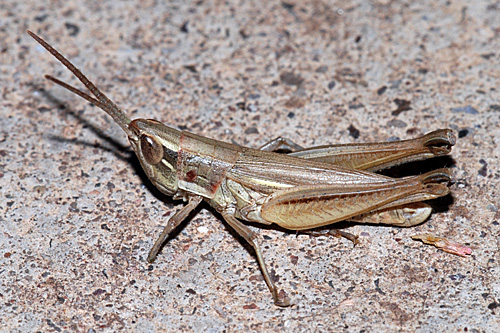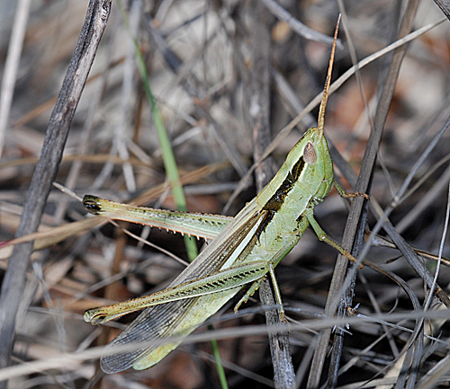 Velvet-striped Grasshopper (Eritettix simplex) occurs on the property in both brown and green morphs. It is most common during spring (22 June 2008)