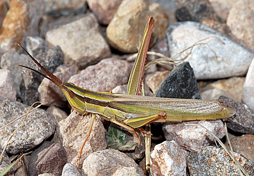 Striped Slantfaced Grasshopper (Amphitornus coloradus) may be abundant in tall grasses. This male was photographed in the driveway (22 June 2008)