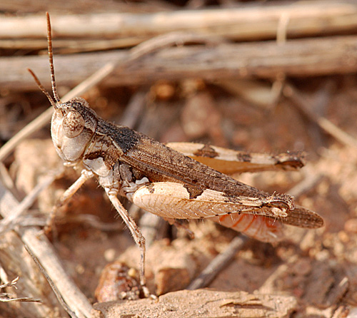 A male White-crossed Grasshopper (Aulocara femoratum) on a patch of open ground (28 August 2008)