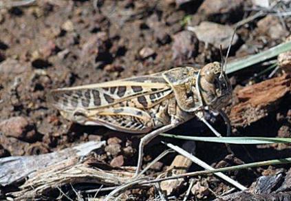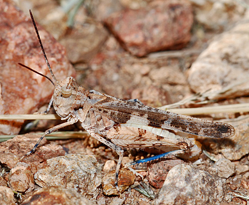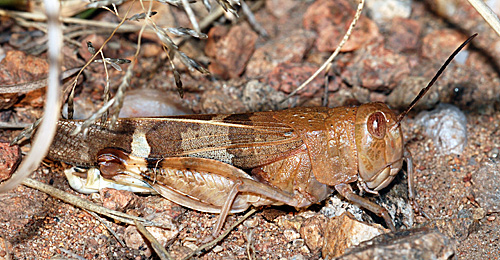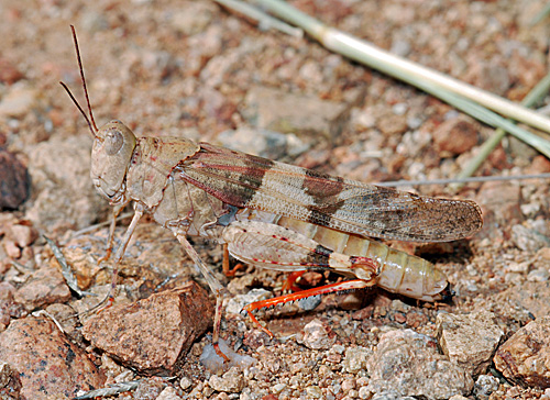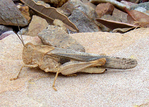 The Aztec Spur-throat Grasshopper (Lactista azteca) can usually be identified by the band on its forewing that is aligned with another on its hind femur. Gray, brown, maroon, cream-colored and speckled individuals may be encountered on different soils. (30 October 2007).