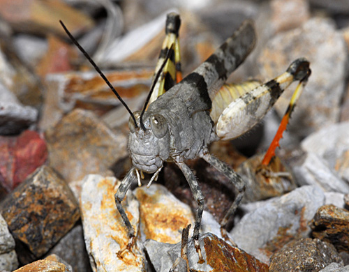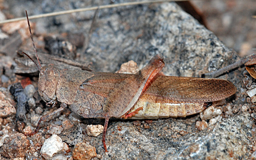 Like many grasshoppers, the Speckle-winged Grasshopper (Arphia conspersa) occurs in a variety of colors so as to match the ground on which it sits. (17 August 2008).