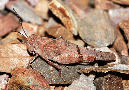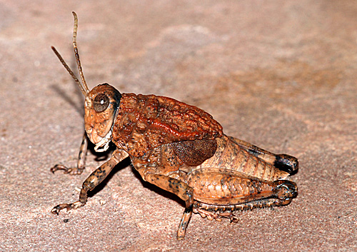 Although visible on this rock, the Oak-leaf Grasshopper (Tomonotus ferruginosus) is nearly impossible to spot in the dry leaf litter it favors. The nymphs are often common during winter. This individual was photographed on Fort Huachuca. (4 April 2008).