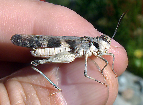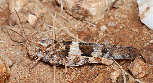 Pallid-winged Grasshopper (Trimerotropis pallidipennis) is the most common and widespread of the large band-winged grasshoppers in the area (26 September 2008).