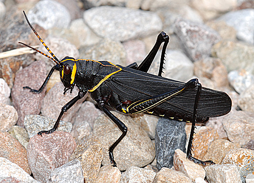 Most Northwestern Red-winged Grasshoppers (Arphia pseudonietana) are solid black or very dark brown. Occasional individuals are pied with paler colors. Like the Horse Lubber, it posesses bright red hindwings. Its loud, crackling flight is a familiar sound during late summer. (26 September 2008).  Ridged Grasshopper (Conozoa carinata). Field marks visible here include the tooth at the lower rear corner of the pronotum, two wing bars that don't cross the forewing (the front bar-more of a spot-shows here), and the ridge atop the entire length of the pronotum. The hind tibiae are yellow. (20 April 2010).