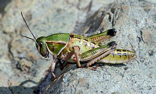 This Plains Lubber (Brachystola magna) is in its final instar: note that the small, pink forewings of an adult are not yet developed. During late summer, both this and the next species may be present by the millions. A small percentage of the population is made up of green individuals such as this one. (17 August 2008)