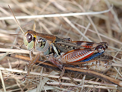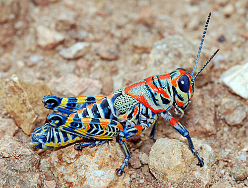 The Pictured Grasshopper (Dactylotum bicolor), is one of our most colorful and distinctive species. Both sexes are short-winged. (25 August 2008)