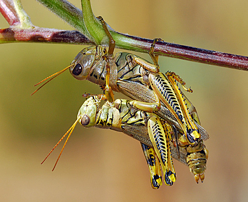 These are mating Arid Lands Grasshoppers (Melanoplus aridus) or the very similar Melanoplus desultorius. Both are common, widespread species and are difficult to tell apart. (30 August 2008)