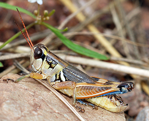 White-lined Bird Grasshopper (Schistocerca albolineata). Apparently most common in mesquite and acacia, it may also be found in the lower oak zone. (3 October 2008)