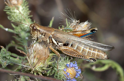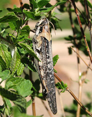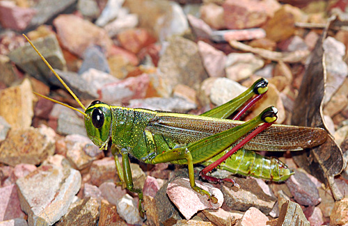 A large, slow-flying grasshopper flushed from mesquites may be a Gray Bird Grasshopper (Schistocerca nitens), one of our largest species. It occurs in a variety of habitats and flies through most of the year-including the winter months. (19 October 2008)