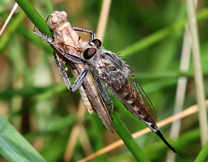 A male Ridged Grasshopper (Conozoa carinata) has fallen prey to a robber fly (Asillidae: Efferia). Fort Huachuca, Cochise Co., AZ (12 June 2009)