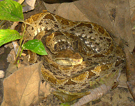 Reaching nearly eight feet in length, the Fer-de-lance (Bothrops asper) is responsible for nearly half the venomous snake bites in Costa Rica. This one was curled up among tree roots at the start of the Bird Trail, Esquinas Rain Forest Lodge (16 February 2009)