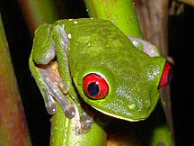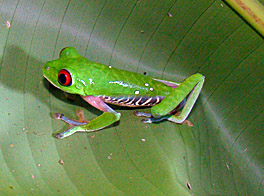Images of the colorful Red-eyed tree frog (Agalychnis callidryas) adorn caps, mugs, T-shirts, and posters; indeed, it has become emblematic of rainforest conservation. These were at a garden pond at Esquinas Rainforest Lodge (13 February 2009 left and 16 February 2009 right).