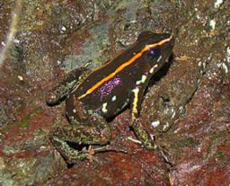 The highly poisonous Gulfo Dulce Poison Dart Frog (Phyllobates vittatus) is a specialty of southwestern Costa Rica. This one was on a small stream at Bosque del Rio Tigre (20 February 2009)